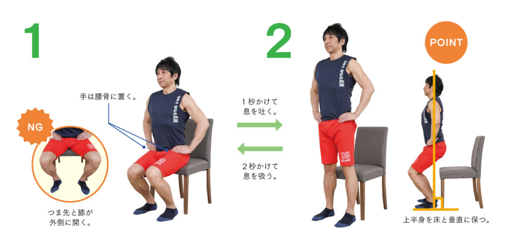 2.息を吐きながら1秒で立ち上がり、息を吸いながら2秒でお尻が座面に触れるまで下げる。
