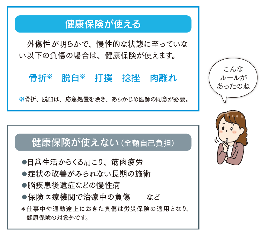 整骨院や接骨院の看板等に“各種保険取扱”や“医療保険療養費支給申請取扱”と書かれているのを見て、どんな施術でも健康保険が使えると思い違いをされていませんか? これは、“限られたケースのみ健康保険が適用になる”という意味で、どんな施術でも健康保険が使えるというわけではありません。知らずに施術を受けてしまわないためにも、整骨院・接骨院にかかるときのルールを知っておきましょう。