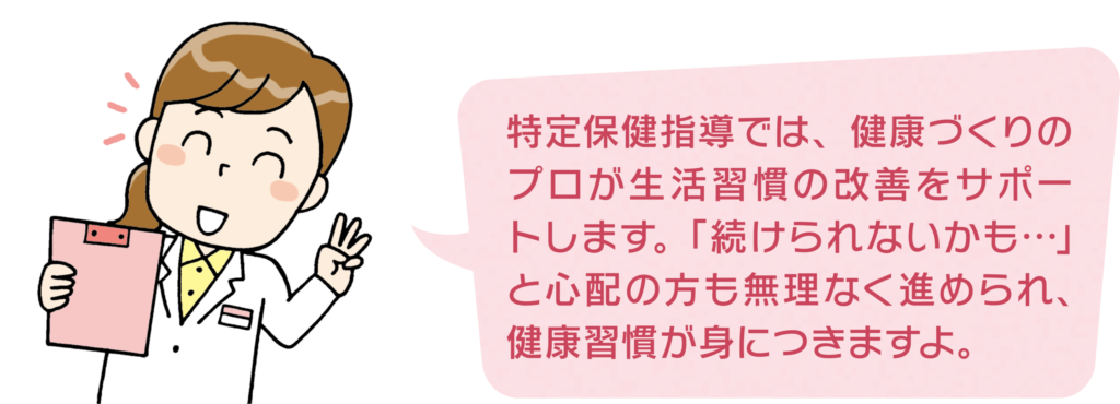 特定健診の結果、生活習慣病のリスクが高いと判定された40歳以上の方に、健保組合または健診機関から「特定保健指導のご案内」をしています。特定保健指導は、保健師や管理栄養士などの専門家が、その人に合った生活習慣の改善法を無料でアドバイスしてくれます。