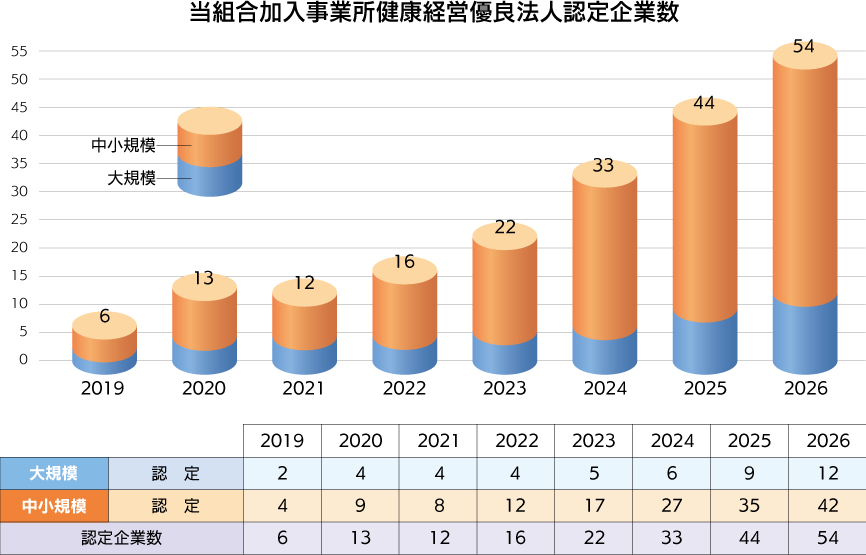 全体では大規模法人部門が3,765法人、中小規模法人部門が23,085法人が認定されましたが、当組合では、大規模法人部門12社、中小規模法人部門42社、計54社が認定されました。