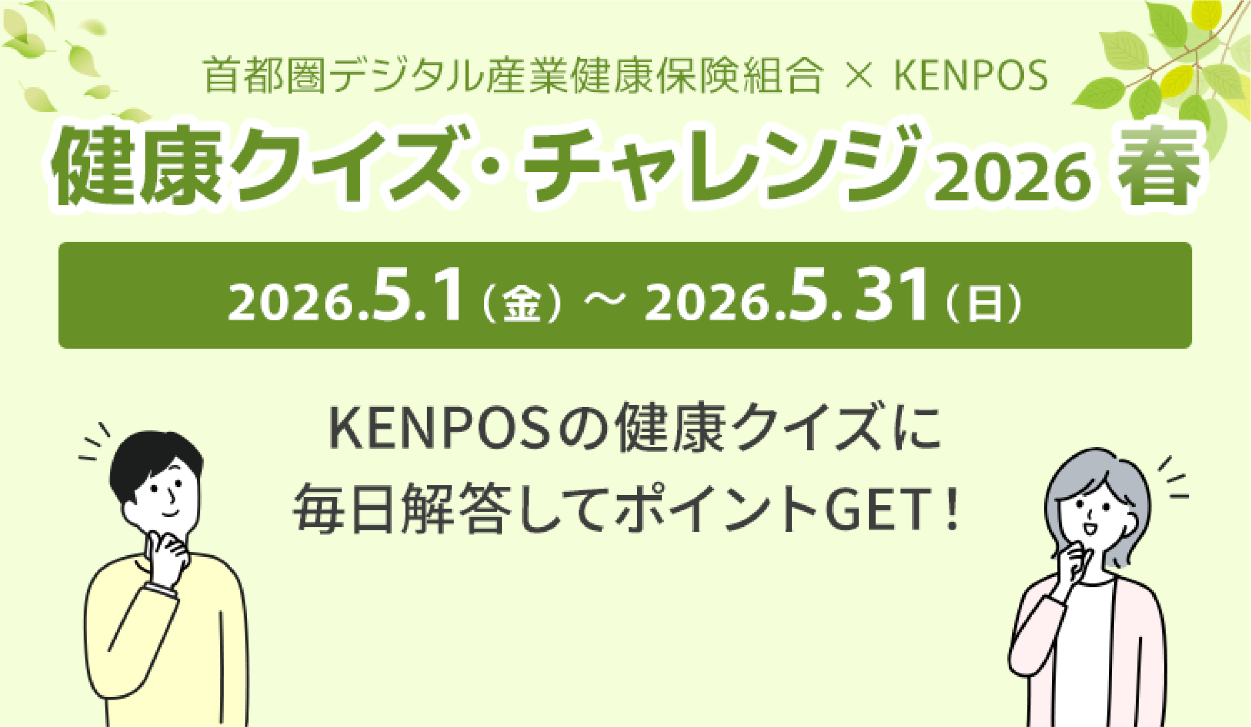2026年5月1日(金)~5月31日(日)の間、KENPOSの健康クイズに毎日解答すると、KENPOSポイントが毎日GETできます! ぜひ参加しましょう。